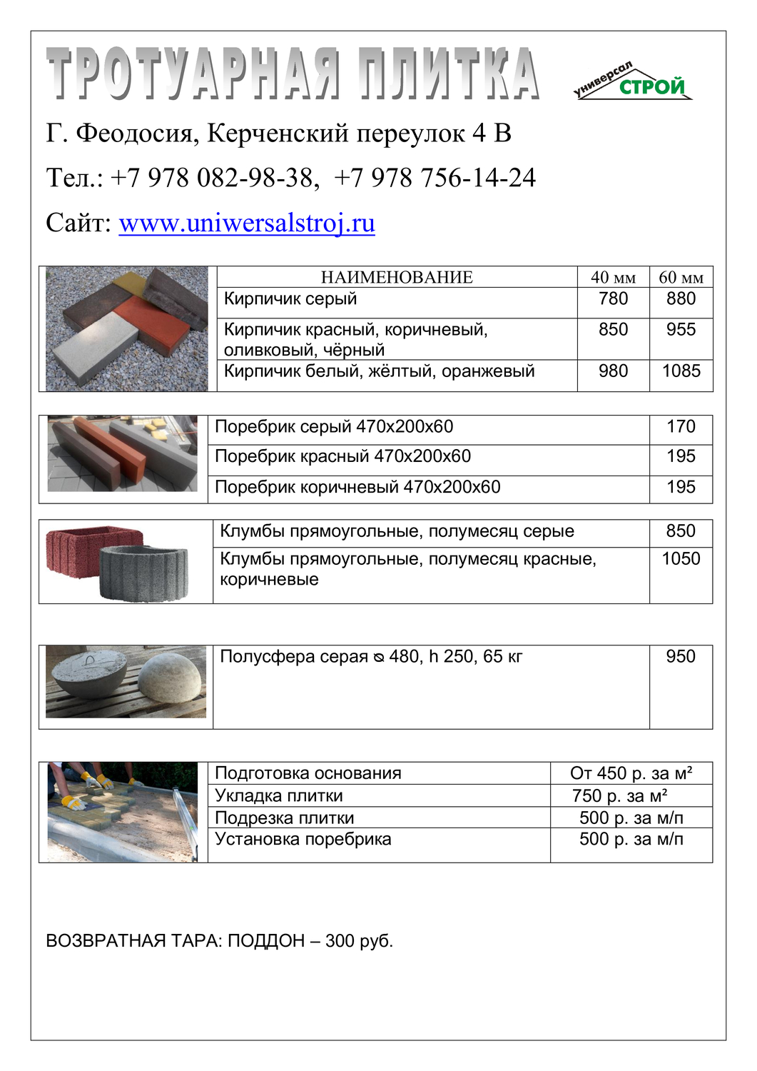 Наша организация уже более десяти лет занимается производством, продажей и укладкой тротуарной плитки в городе Феодосия и других городах Крыма. Кроме того мы производим бордюры, цветочные клумбы разных форм и расцветок, колодезные кольца, плиты ФБС. Наше новое направление - металообработка. На территории производства теперь работает токарь, а также слесаря и сварщики. В парке станков добавилась гильотина, вальцы, токарный, сверлильный, заточной. Ассортимент продукции постоянно расширяется, качество всех изделий строго контролируется и весь дружный коллектив делает все, чтобы Вы оставались довольны нашими изделиями и нашей работой долгие годы.